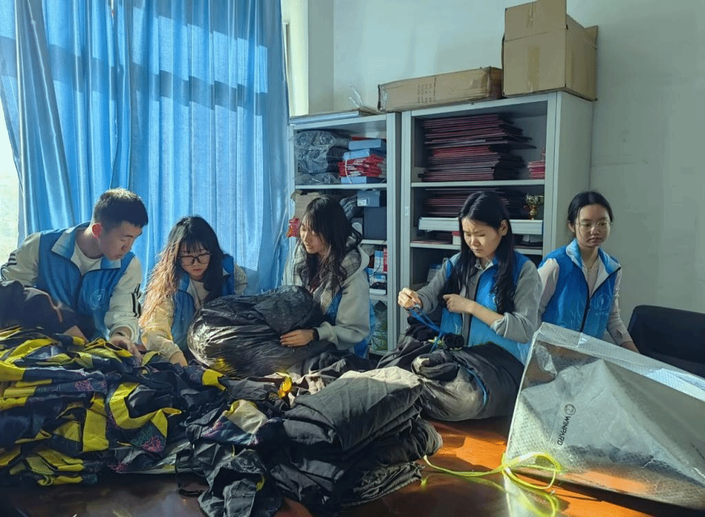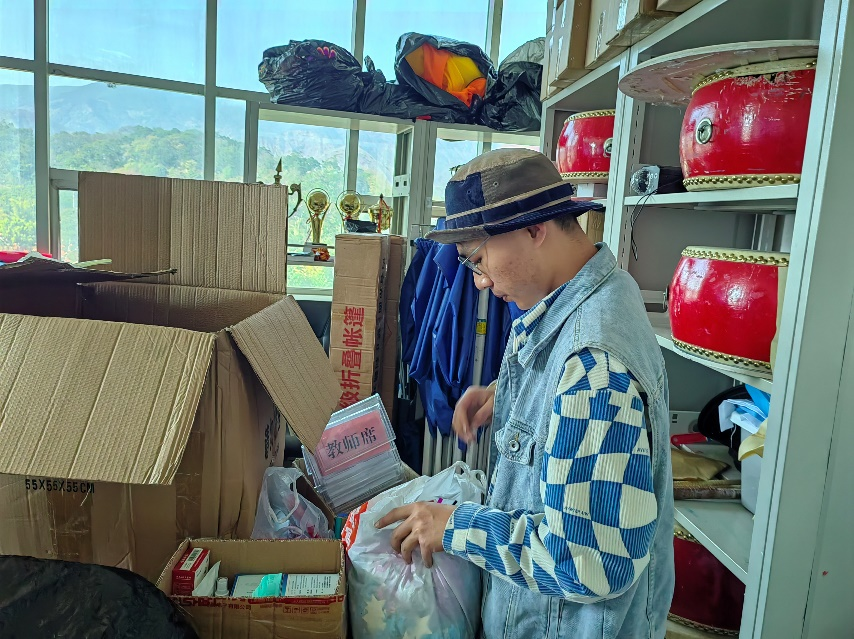 镜头一转,活动内也是一派忙碌景象。志愿者们正有条不紊地将物品分类整理,桌面和地面也被仔细除尘去灰。经过一番努力,原本杂乱的活动室在同学们的巧手下焕然一新,清新如拭,为日常开展活动提供极大便利。
