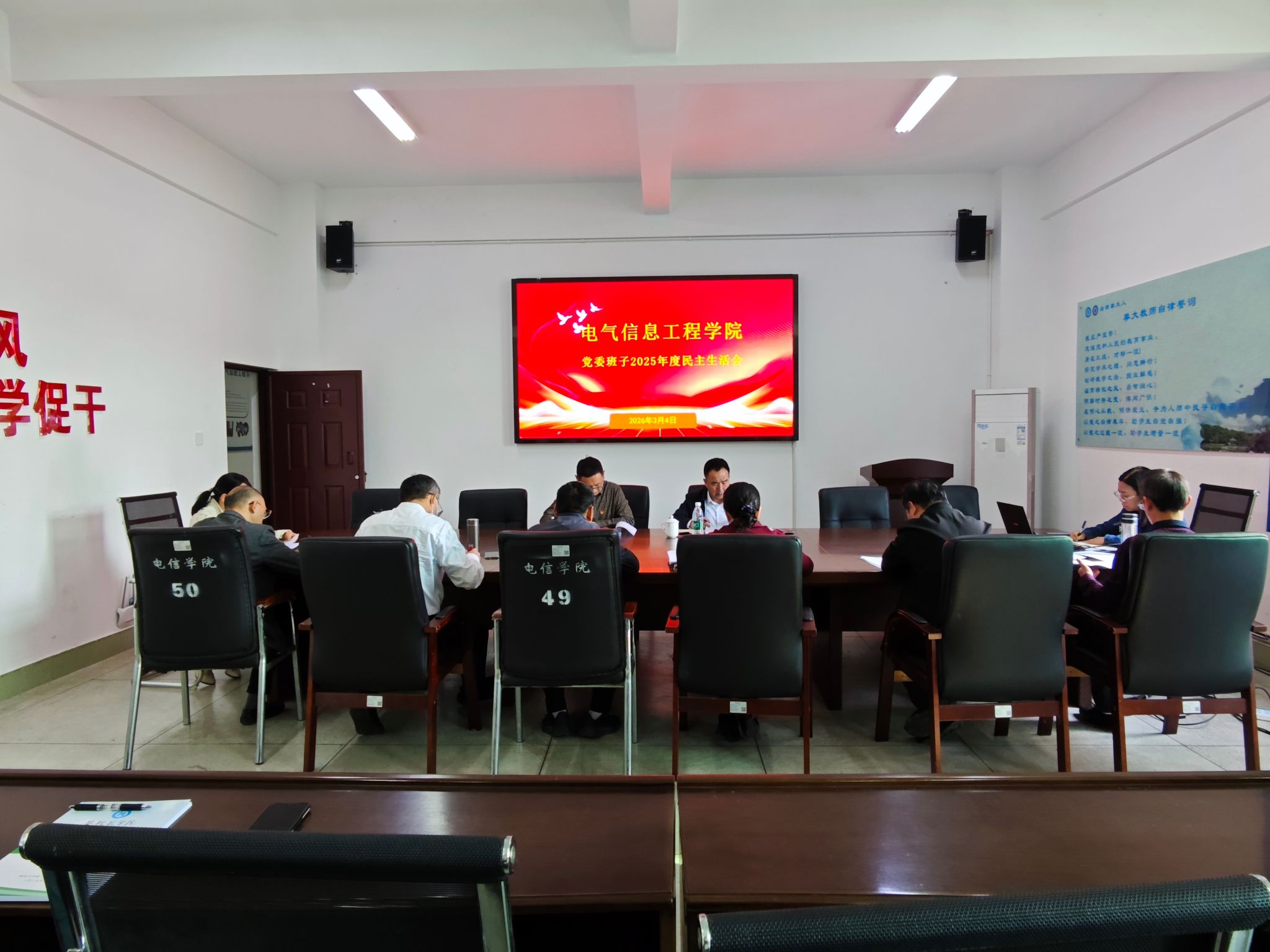 3月4日下午, 电气信息工程学院党委班子2025年度民主生活会在分析测试中心7楼会议室召开。校党委常委、宣传部部长苏兴仁、省纪委监委驻攀枝花学院纪检监察组纪检监察室审查调查科科长黄毅同志到会指导。学院党委书记周敏主持会议,学院班子全体成员参会,相关人员列席。