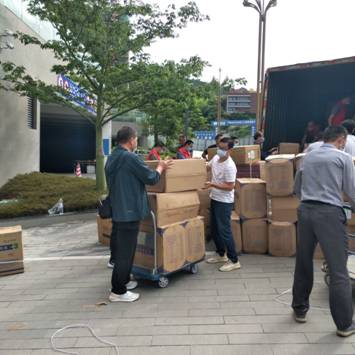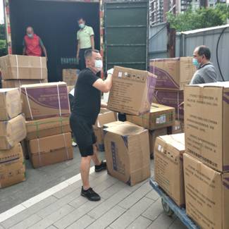 卸车,转运,堆码,一切紧张而有序;虽然满身灰尘,肢体酸痛,但透过口罩仍然能感受到每个人的脸上堆着笑容,这是对疫情的蔑视,是对生活的热爱,是志愿服务的内心愉悦。